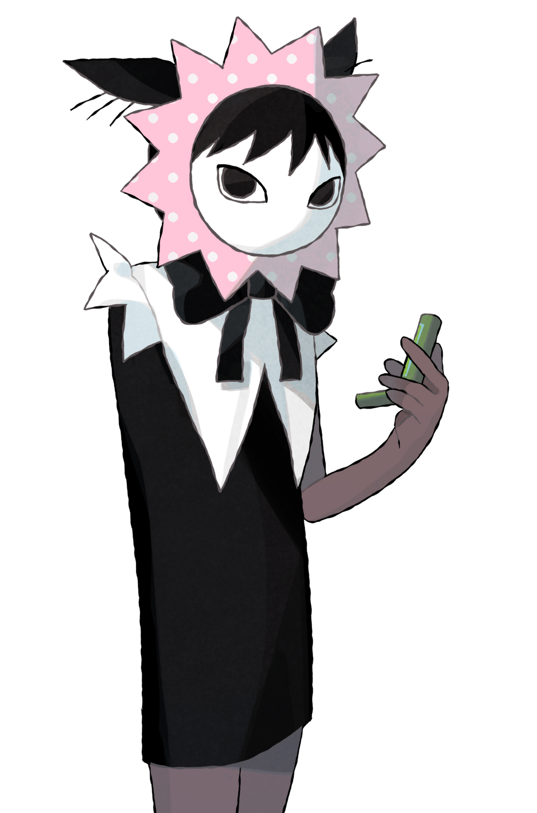 Intern is an anxious, easily overwhelmed worker who is commonly assigned to assist Momo and Farfalle in their various escapades. They are often overlooked and typically are only brought out of the background when some low-level task arises or others require a comedic punching bag, though in any instance they still try their best to be useful. However, Intern is also the only one to consistently question their surroundings, calling to attention the strange actions of those around them and feeling unsure what to do in more extreme scenarios. Their behaviour can also shift very suddenly and drastically, going from sharp to gentle, or attentive to indifferent on a dime. What does not change is their unwavering obedience, as well as their general confusion. Intern uses the pronouns they/them, but others consistently refer to them via he/him and they never correct it.voice: